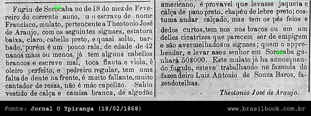 | | | Notícia sobre a fuga de escravizado Data:18/02/1868 |