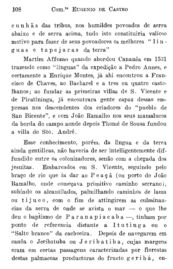 1°. A Fundação De São Paulo - Jaime Cortesão 1955 Atento, pois, à importância da língua da terra, Martim Afonso de Souza,comandando a expedição de 1530, ordenada por um D. João III motivado pela cobiça de ouro e prata que se noticiava haver em abundância na bacia do Prata e pela preocupação do aumento da invasão da costa brasileira por flibusteiros franceses (CORTESÃO, 1955:77-87), fez-se equipar de dois excelentes línguas em sua missão também de caráter exploratório, de defesa e colonizador. Um deles era Enrique Montes, na condição de provedor da armada, “que habitara terras catarinenses durante doze anos” (CORTESÃO,1955:51, 95-6, 101 e 111); o outro era o piloto Pero Anes (CORTESÃO, 1955:111 e 114). Com sua equipe de homens, entre os quais se incluíam esses intérpretes (...)  ver maisFontes: [1] História da Capitania de São Vicente. Pedro Taques de Almeida Pais Leme (1714-1777), 01/01/1755