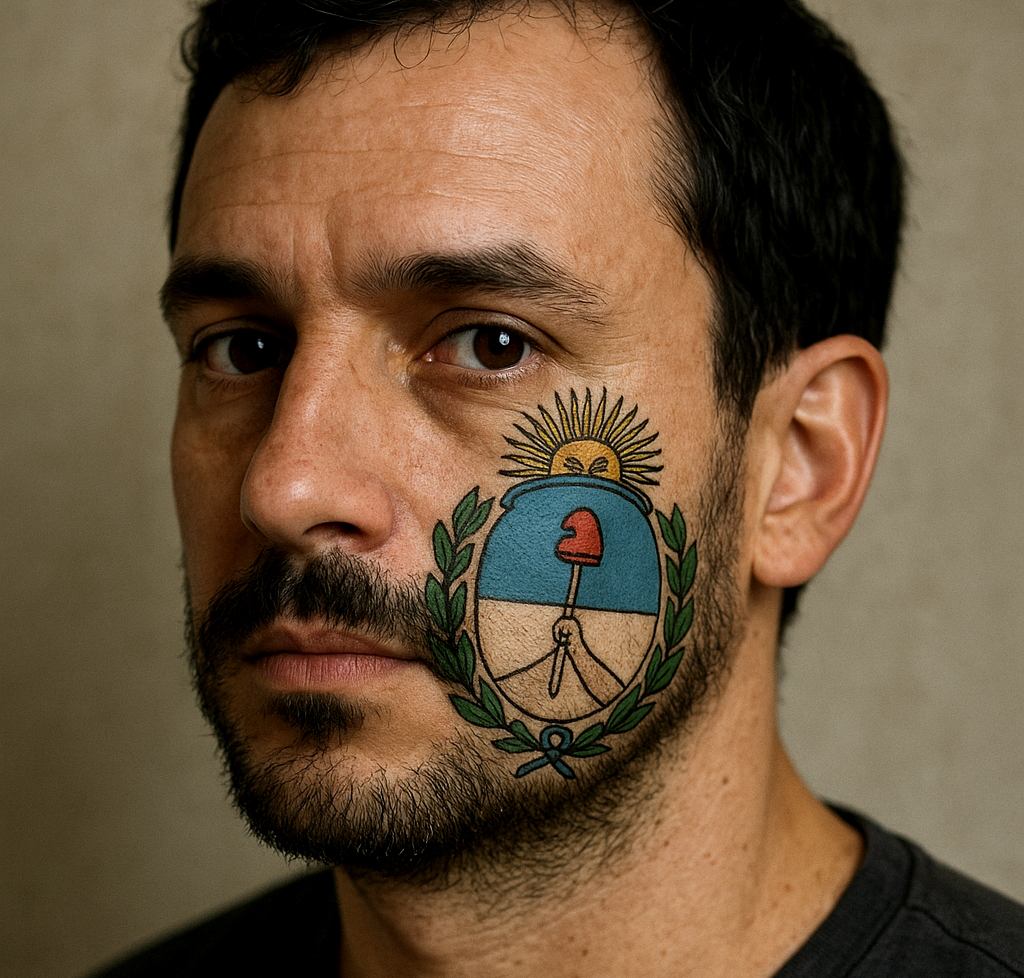 "crie o retrato de um homem que nasceu em buenos aires, com uma tatuagem do brasão de buenos aires em seu rosto"