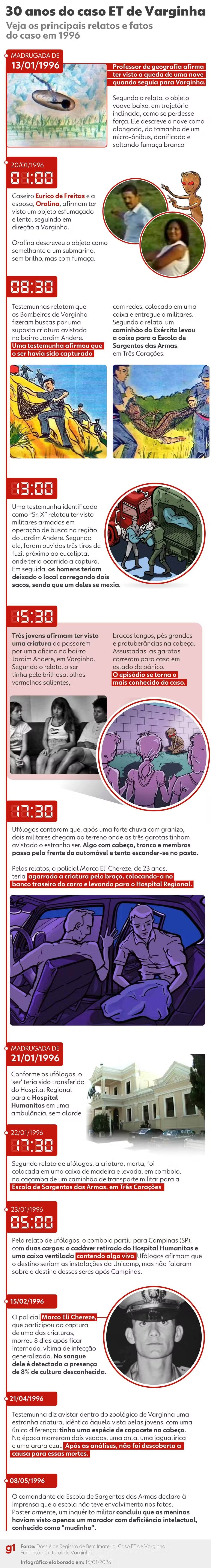 Testemunhas cobram reconhecimento oficialPassadas três décadas, as mulheres que afirmam ter visto a criatura em um terreno baldio seguem defendendo o relato e pedem um reconhecimento oficial.“A gente quer que um dia alguém chegue e diga: foi verdade. A gente pegou, levou, e isso aconteceu”, afirmou a professora Liliane Silva."Nada acontece por acaso. A gente cortou o caminho, passou por um terreno, a gente não estava acostumada, a gente viu a criatura, a gente viu, né, viva ainda, né. Então a gente é especial. Esses 30 anos fez a cabeça da gente entender que a gente é especial, que a gente é escolhida", completou Liliane.“Quem está esperando a verdade somos nós”, disse Kátia Xavier, cuidadora e palestrante.O Mistério de VarginhaAo longo de três episódios, a série documental “O Mistério de Varginha” revisita o caso que ganhou repercussão internacional há 30 anos no Sul de Minas, reunindo depoimentos inéditos, além de documentos, áudios, arquivos históricos e registros oficiais nunca exibidos. A investigação apresenta diferentes versões sobre o que teria acontecido na cidade e confronta relatos que marcaram o episódio.Entre os entrevistados estão personagens centrais da história, como o ufólogo Ubirajara Rodrigues, o primeiro a investigar o caso. A série aborda a mudança de posição dele ao longo dos anos, já que, depois de defender a existência da suposta criatura, passou a afirmar que ela nunca existiu. O documentário também traz depoimentos de militares, relatos de moradores e a recuperação de materiais jornalísticos da época.A produção acompanha ainda Kátia, Liliane e Valquíria, conhecidas como as “três meninas do ET”, que relembram o episódio e mostram como estão atualmente. Dirigida por Ricardo Calil e Paulo Gonçalves, a série vai ao ar após O Auto da Compadecida 2 e também ficará disponível no Globoplay, com produção executiva de Fernanda Neves e direção artística de Monica Almeida.
